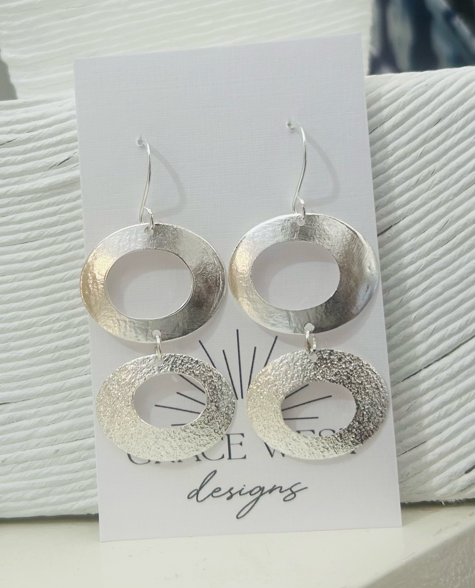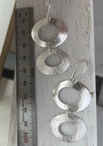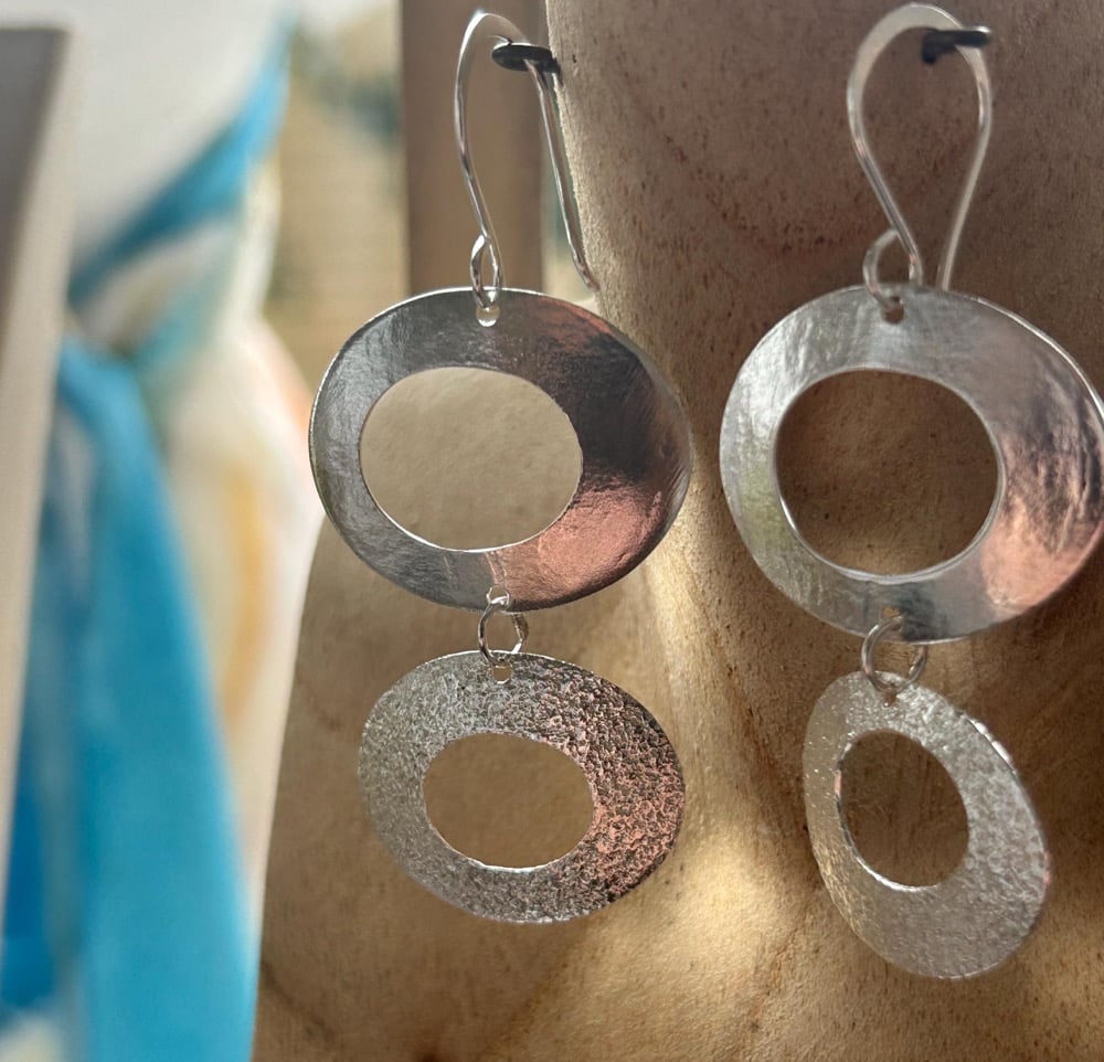 Contemporary double drop off centre style earrings with contrasting heavy texture verses highly polished. These gorgeous heavily textured double drop circle earrings are crafted by hand and made by me entirely from recycled sterling silver.