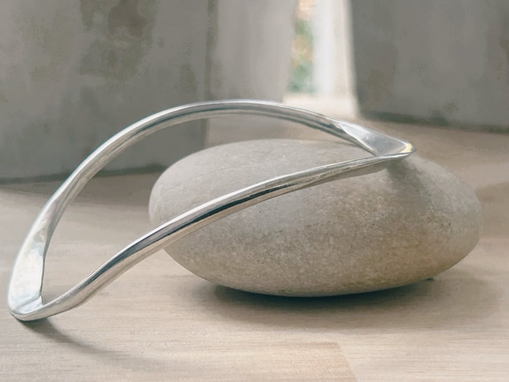 The Waveform bangle is s beautiful, sterling silver statement bangle with perfect weight and balance. The bangle moves effortlessly around your wrist showcasing its curves that echo movement and flow.